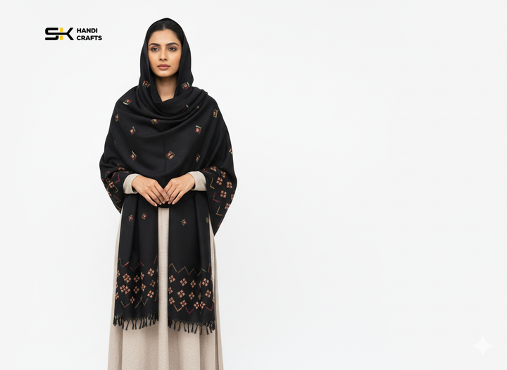 Discover the charm of traditional Swati artistry with our Handmade Black Pashmeena Shawl — a timeless blend of luxury, warmth, and cultural elegance.